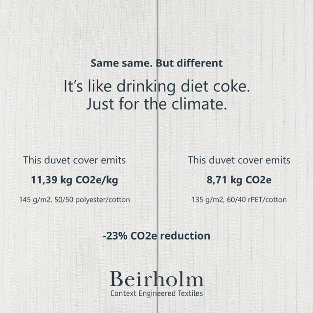 Our new bed linen quality, Q784, is a beautiful blend of 60% recycled polyester and 40% cotton. Compare it to our good but old model – a typical market standard – in 50% virgin polyester and 50% cotton.